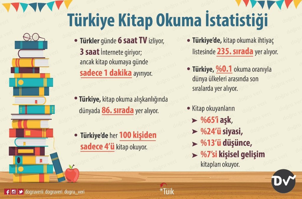 2016 yılında yapılan tüik araştırmasına göre; Kitap okumak ihtiyaç listemizin 235. Sırasında yer alıyormuş. Ülke genelinde 6 saat televizyon, 3 saat internet kullanılırken 1 dakika kitap okunuyormuş. Şu an bu veri hala düşük düzeylerde. 2008 – 2019 arası %12 değişim var fakat bu yeterli hatta geçerli bir değişim değil. Dünya sıralamamızı görmek ister misiniz;