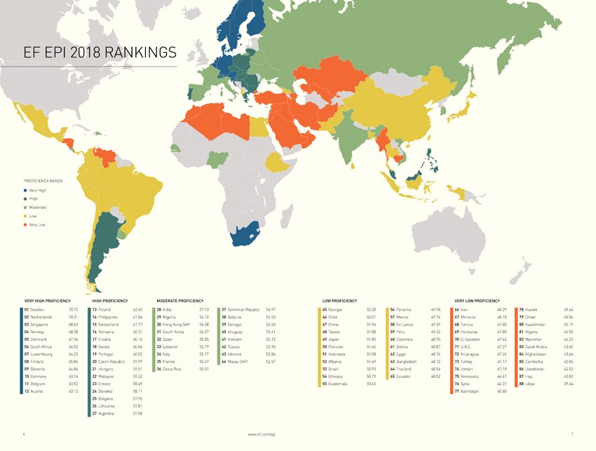 2016 yılında açıklanan İngilizce Yeterlilik Verileri Proficiency sınavına göre değerlendirilmiştir. Benim de daha önce hazırlık okulunda vermiş olduğum bu sınav; okuma, dinleme ve yazma kısımlarından oluşur. Paragraf, cümle ve kelime okuma kısmında, note-taking (not alma), duyduğunu anlama dinleme kısmında ve verilen konuya göre essay (kompozisyon) 350-500 kelime arası yazarak oluşturulan bir sınavdır. Bizim verilerimiz burada da pek iç açıcı değil. İngilizce dünya dili olması sebebi ile baz alınmıştır. 2016 yılında 26 Avrupa Ülkesi içerisinde sondan ikinci olan Türkiye, Dünya genelinde 72 ülke arasında 51. Sırada bulunmuştur. Aşağıda 2018 yılı EF EPI (Education First, English Proficiency Index) verileri bulunuyor;